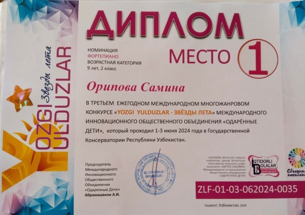 G’uzor tuman 4-son bolalar musiqa va san’at maktabi Fortepiano mutaxassisligi o’quvchisi Oripova Samina 1-2-3-Iyun 2024-yil Toshkentda bo’lib o’tgan «Yozgi yulduzlar» nomli xalqaro tanlovga qatnashib 1-o’rinni qo’lga kiritdi.