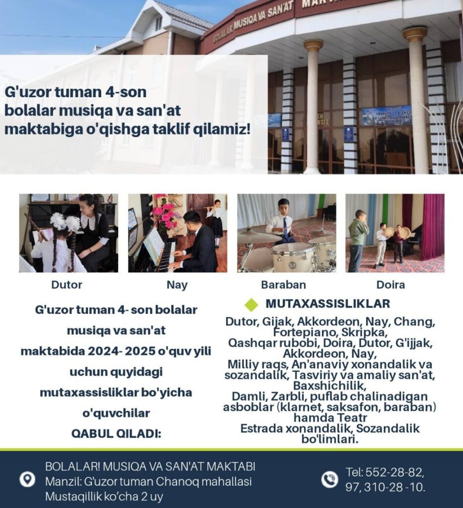 G’uzor tuman 4- son bolalar musiqa va san’at maktabida 2024- 2025 o’quv yili uchun quyidagi mutaxassisliklar bo’yicha o’quvchilar QABUL QILADI: ✅Dutor, ✅Gijak, ✅Akkordeon, ✅Nay, ✅Chang, ✅Fortepiano, ✅Skripka, ✅Qashqar rubobi, ✅Doira, ✅Dutor, ✅G’ijjak, ✅Akkordeon, ✅Milliy raqs, ✅An’anaviy xonandalik va sozandalik, ✅Tasviriy va amaliy san’at, ✅Baxshichilik, ✅Damli, Zarbli, puflab chalinadigan asboblar (klarnet, saksafon, baraban) ✅Teatr ✅Estrada xonandalik, […]