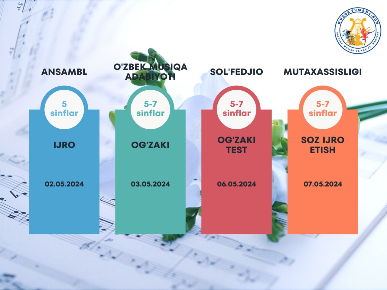 G’uzor tuman 4-son bolalar musiqa va san’at maktabida 2023-2024 o’quv yilida bitituvchi sinflar Imtihon jadvali