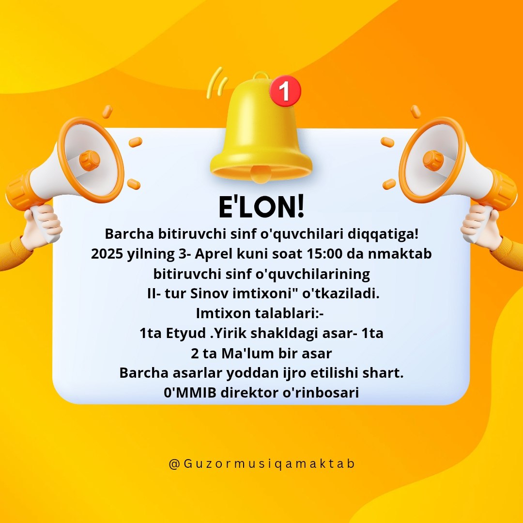 Barcha bitiruvchi sinf o'quvchilari diqqatiga! 2025 yilning 3- Aprel kuni soat 15:00 da maktab bitiruvchi sinf o'quvchilarining II- tur Sinov...