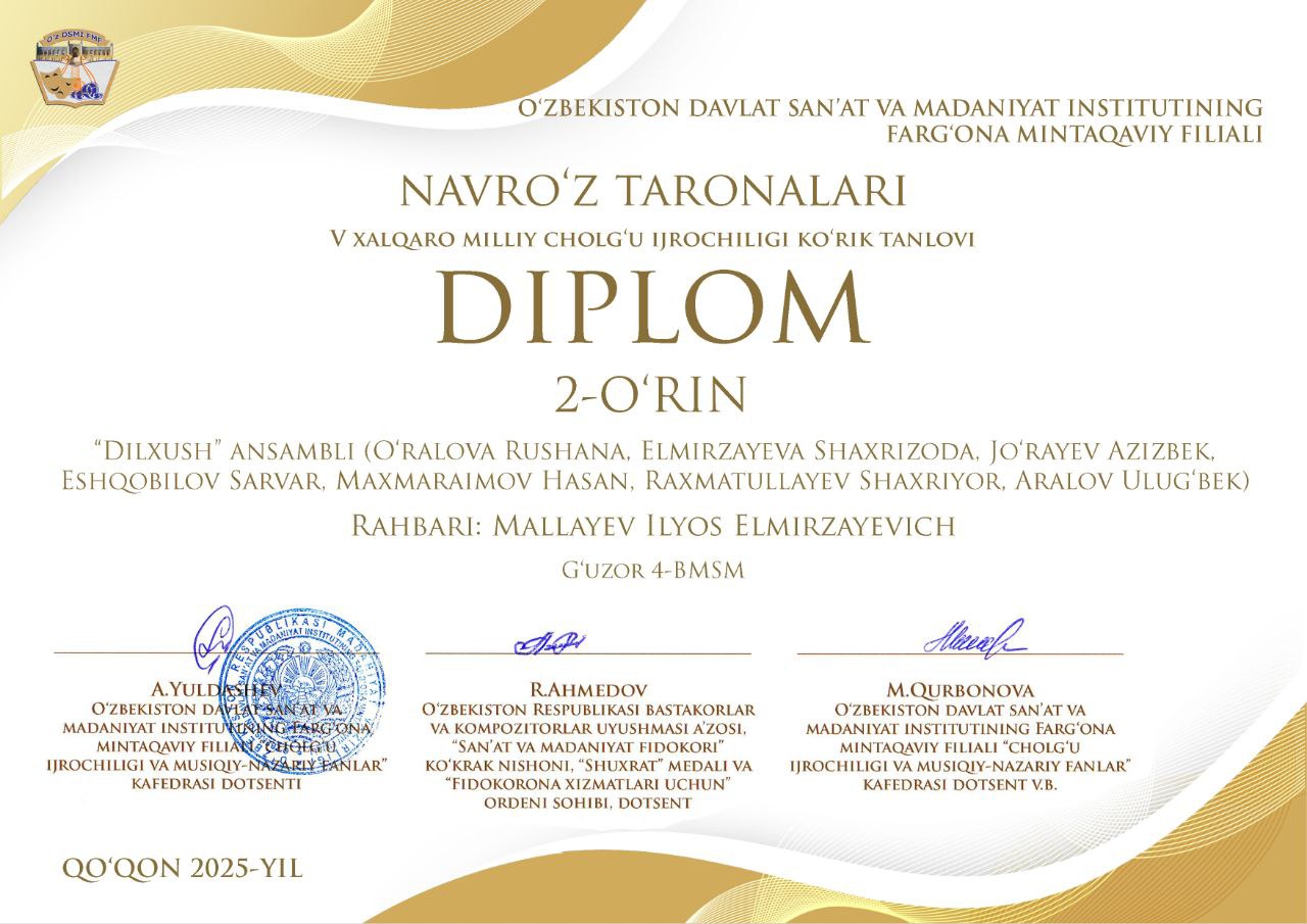 G'uzor tuman 4-son bolalar musiqa va san'at maktabi "Dilxush" ansambli jamoasi "Navro'z taronalari V-xalqaro milliy cholg'u ijrochiligi ko'rik tanlovida qatnashib...