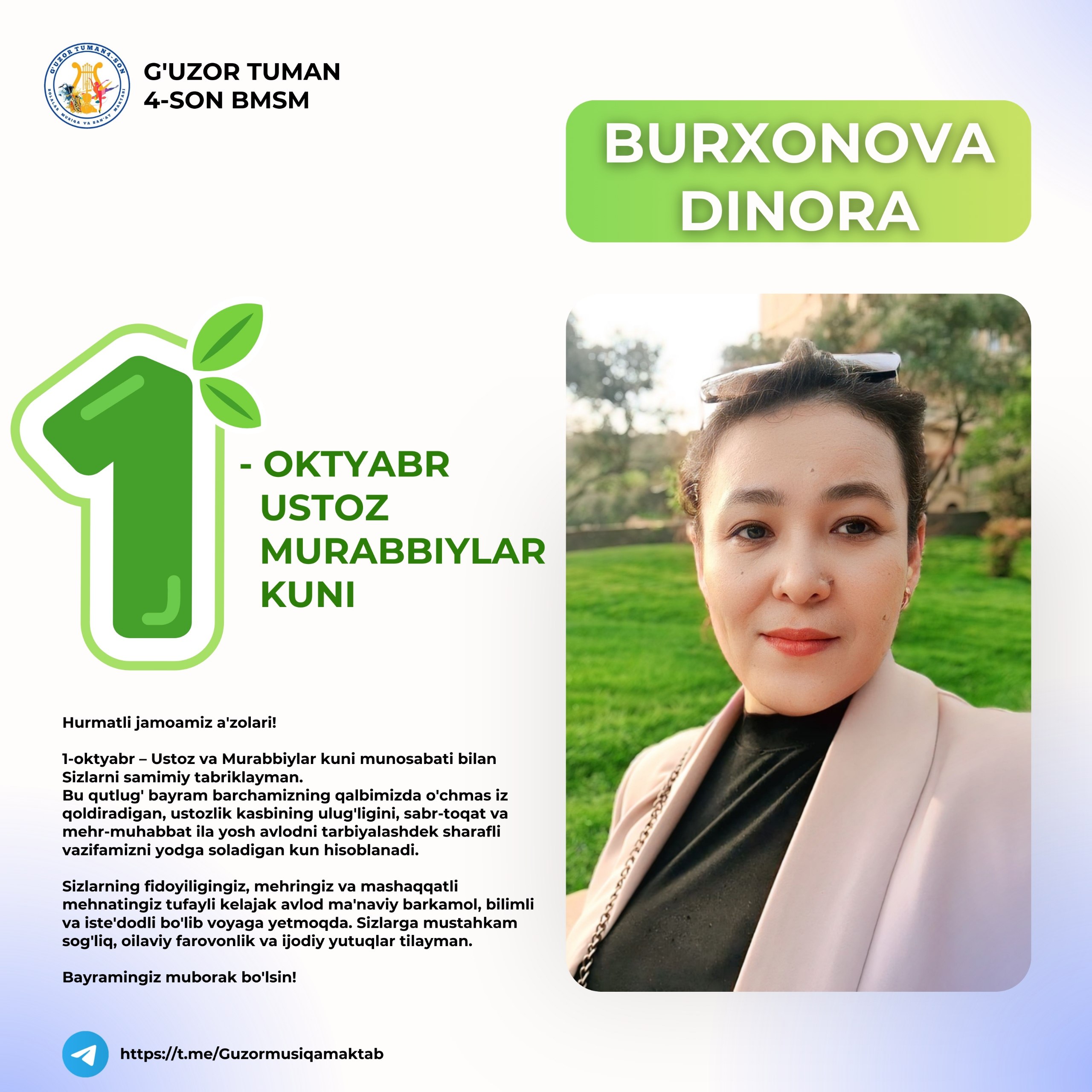 1-oktyabr – Ustoz va Murabbiylar kuni munosabati bilan Sizlarni samimiy tabriklayman. Bu qutlug' bayram barchamizning qalbimizda o'chmas iz qoldiradigan, ustozlik...
